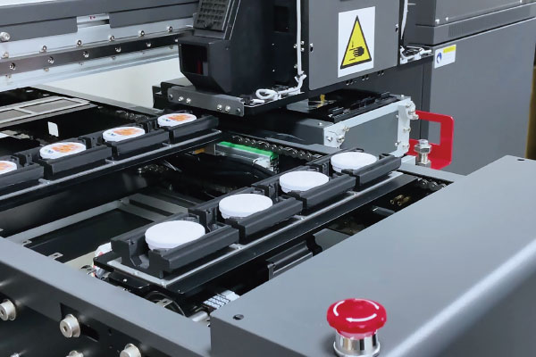 根據(jù)打印物體的尺寸和形狀,定制的治具支持準(zhǔn)確定位和傳送。下圖中,DG54正在打印圓形盒蓋。