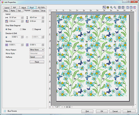 ColorPRINT 軟件支持圖案連續(xù)重復打印,此功能專門為織物打印而設計。用戶可以輸入打印區(qū)域的尺寸,定義重復的模式,設置拷貝圖案的鏡像方式。