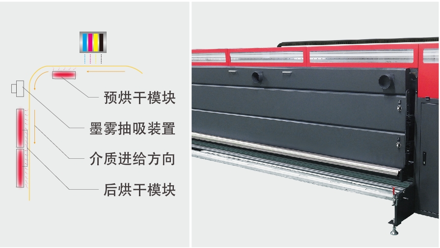 烘干系統(tǒng) CR33 的烘干系統(tǒng)由預(yù)烘干模塊、墨霧抽吸裝置及后烘干模塊組成。高效烘干系統(tǒng)可實(shí)現(xiàn)良好的墨水吸附,確保收卷前面料有效烘干。