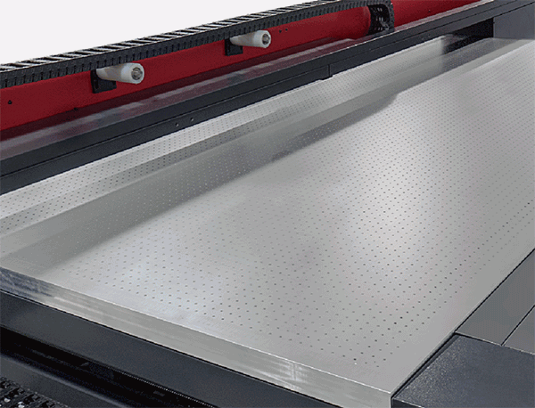 使用雙原點(diǎn)模式,從而在橫梁發(fā)生偏斜的情況下自動(dòng)校準(zhǔn)平行度,確保打印質(zhì)量。 | 四區(qū)真空吸風(fēng)平臺(tái)可靈活選擇開啟 1 至 4 個(gè)吸風(fēng)區(qū),牢牢地緊固打印材料,確保在多 pass 打印和雙向打印模式下的準(zhǔn)確套色。 |