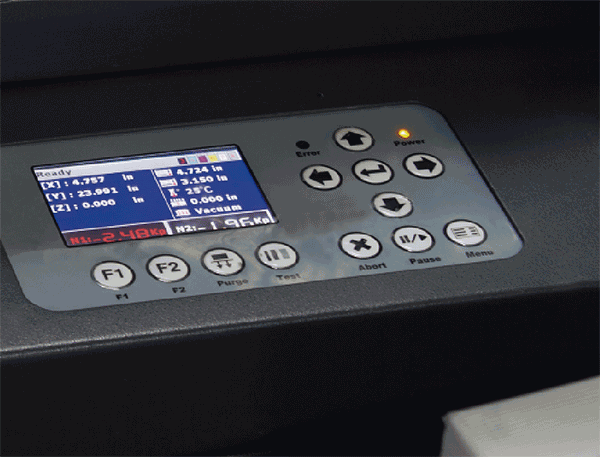 PCS 可處理輸入的 RIP 數(shù)據(jù),其提供的軟件界面允許 RIP 軟件直接向打印機(jī)發(fā)送打印作業(yè)。 控制界面的功能包括噴頭清洗、噴頭校準(zhǔn)、電機(jī)速度設(shè)定和噴頭設(shè)置等。