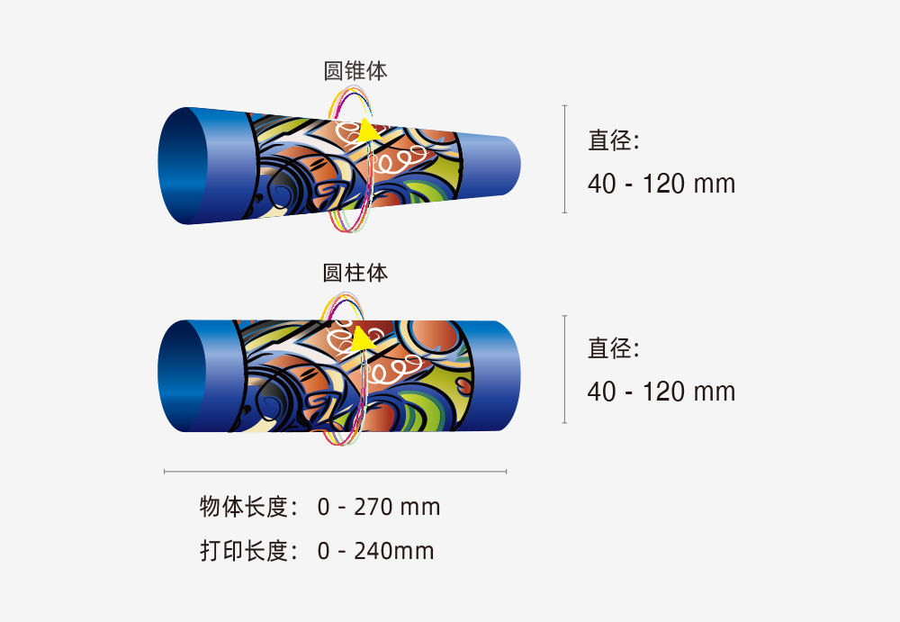 針對(duì)圓錐體和圓柱體噴墨打印的特殊性而特別研發(fā)的“旋轉(zhuǎn)打印 Pass 技術(shù) (RPPM)”和“噴頭漸進(jìn)排列技術(shù)”,賦予 TBC 在打印圓錐體和圓柱體時(shí)擁有令人贊嘆的打印速度和打印質(zhì)量。