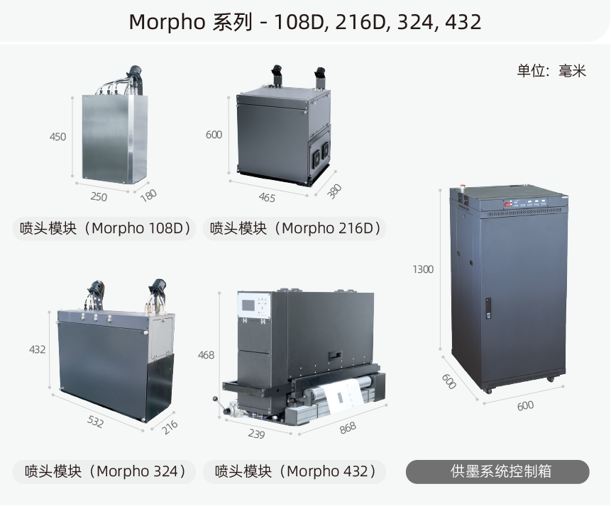 Morpho 系列噴墨打印引擎共包含6個型號—108/ 108D/ 216/ 216D/ 324/ 432,應(yīng)用于單色可變數(shù)據(jù)印刷(VDP)噴墨打印,能以標準或雙倍速度打印108 mm、216 mm、324 mm或432 mm的寬度。