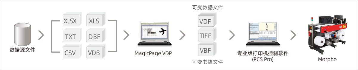 Morpho與MagicPage VDP軟件及PCS Pro軟件無縫對接工作,打造出高效的VDP工作流程。MagicPage VDP軟件用戶可通過豐富的編輯工具設(shè)計和修改輸出模板。安裝在主機的專業(yè)打印機控制軟件 PCS Pro,提供友好的圖形用戶界面,既可交互控制Morpho系列噴墨打印引擎,又可設(shè)置其選項、跟蹤打印狀態(tài)。