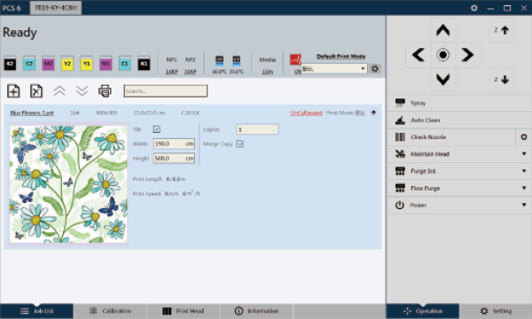 PCS 可處理輸入的 RIP 數(shù)據(jù),其提供的軟件界面允許RIP軟件直接向打印機發(fā)送打印作業(yè)。 控制界面的功能包括噴頭清洗、噴頭校準、電機速度設定和噴頭設置等。