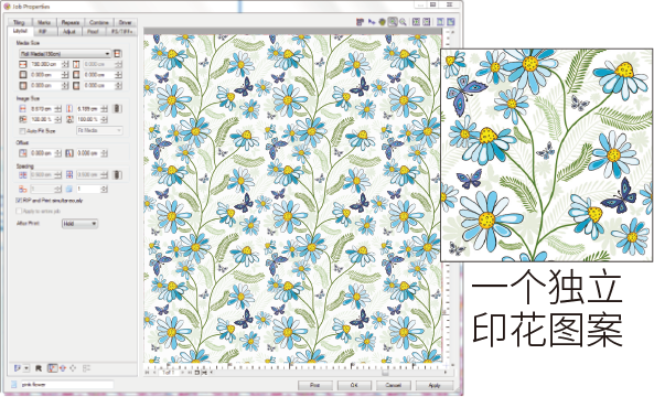 ColorPRINT 軟件支持圖案連續(xù)重復打印,此功能專門為織物打印而設計。用戶可以輸入打印區(qū)域的尺寸,定義重復的模式,設置拷貝圖案的鏡像方式。