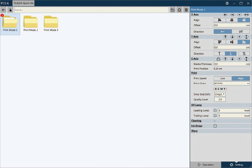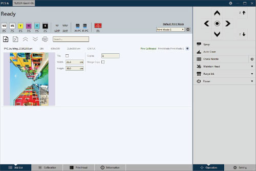 PCS 可處理輸入的 RIP 數(shù)據(jù),其提供的軟件界面允許 RIP 軟件直接向打印機發(fā)送打印作業(yè)。 控制界面的功能包括噴頭清洗、噴頭校準、電機速度設定和噴頭設置等。